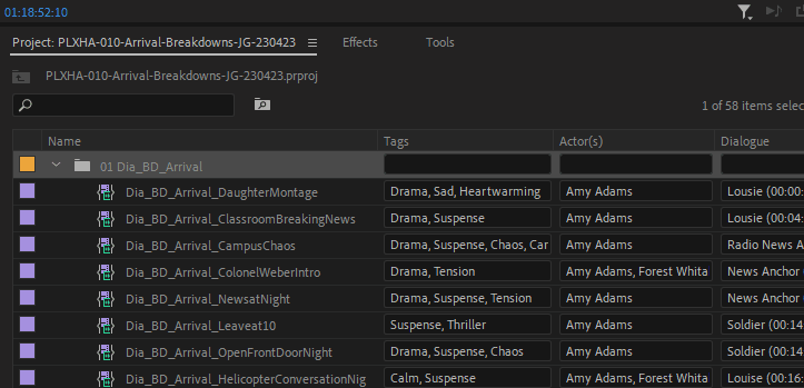 An Adobe Premier project that allows your team to search the entire film by "Actor(s) name", "Scene genre", and "line of dialogue".